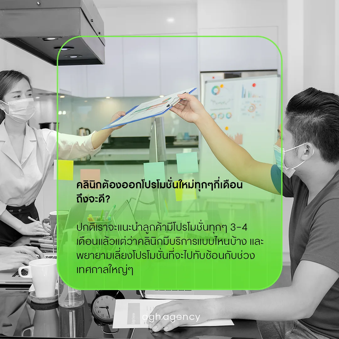 ต้องวัดผลจากตัวเลข ฟีดแบคลูกค้า หรือข้อมูลจากระบบการขายของแต่ละสาขา นำมาพิจาณาว่าควรจะเปลี่ยนโปรโมชั่นบ่อยแค่ไหน น่าจะเป็นทางออกที่สมเหตุผลที่สุด เปลี่ยนโปรแต่ละครั้งต้องออกแบบสื่อใหม่หมด ต้นทุนการตลาดอาจเพิ่มขึ้น กระทบต่อการเงินของคลินิก นอกจากนี้ยังทำให้การสร้างแบรนด์และการบริหารจัดการซับซ้อนขึ้น การต่อรองราคาจากลูกค้าอาจเพิ่มมากขึ้น ซึ่งทั้งหมดนี้อาจส่งผลให้ธุรกิจไม่สามารถรักษากำไรได้ตามที่คาดหวัง ดังนั้น การวางแผนโปรโมชั่นที่มีความหลากหลายแต่ไม่ถี่เกินไปจึงเป็นสิ่งสำคัญในการสร้างลูกค้าประสบการณ์ที่ดีค่ะ